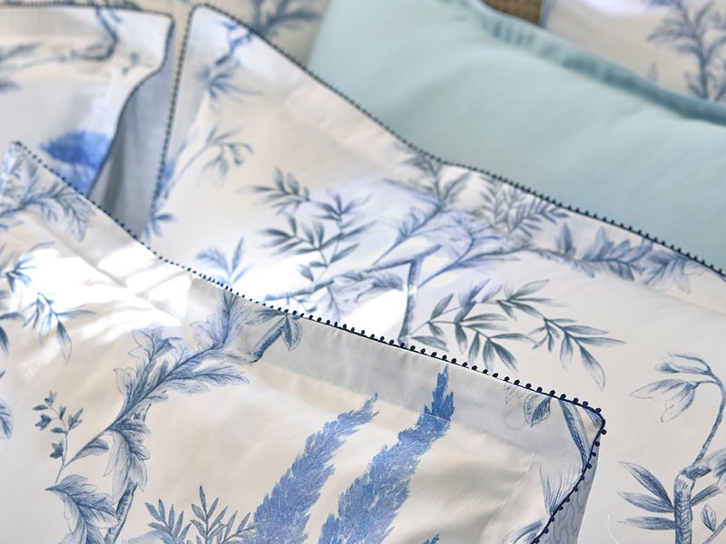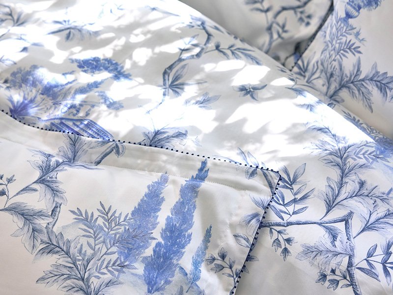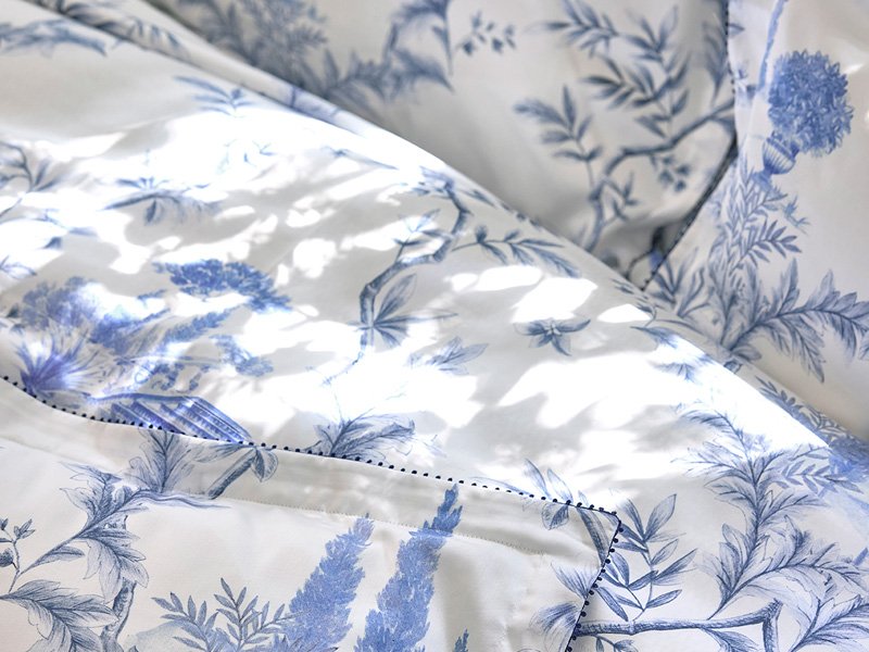 Die erstaunliche Wendebettwäsche LUBERON von Alexandre Turpault überzeugt durch ihre floralen Elemente und den Landschaften der Provence, die sich in einem leuchtenden Blau wunderbar von dem schneeweißen Untergrund abheben. Dieses Dessin strahlt so viel Sehnsucht nach diesem Ort, der wunderschönen Gebirgskette Luberon in der Provence, aus, so dass man die Lavendelfelder förmlich riechen kann…