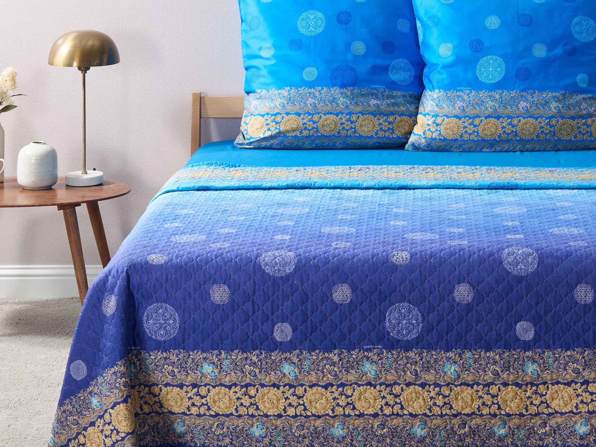 Die Tagesdecke PALLAVICINO C1 azurblau gibt es in vier Größen. Gefertigt werden diese aus 1oo% Baumwolle, die Füllung ist aus Polyester. Die gesteppten Bettüberwürfe sind bis 40 Grad waschbar und auch trocknergeeignet. Durch die Verwendung eines hochwertigen Drucks behalten die Farben ihre Intensität und bleichen nicht aus. Somit sind alle Voraussetzungen für eine ansprechende Tagesdecke für Ihr wundervoll dekoriertes Bett gegeben…