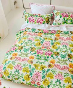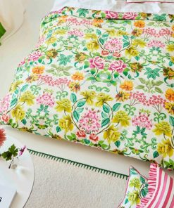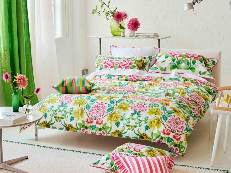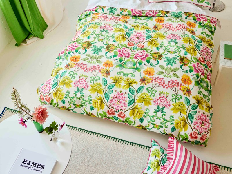 Die Bettwäsche ELEONORA FUCHSIA 155×200 in feiner, sommerlich leichter Perkalqualität ist für uns eines der Highlights der neuen Designers Guild Frühjahr/Sommerkollektion 2025. Das farbenfrohe, für die Designerin Tricia Guild so typische, florale Muster überzeugt durch seine Opulenz auf der einen und seine frische Austrahlung auf der anderen Seite. Die gekonnte Anordnung von leuchtendem Grün, auffallendem Pink und Fuchsia und die Akzentuierung durch gelbe und zart orangefarbene Blumenblüten verleiht der Bettwäsche eine gewisse Lebendigkeit. Diese wird letztendlich durch die bunten Schmetterlinge, die durch das Blumenmeer fliegen, vollkommen.