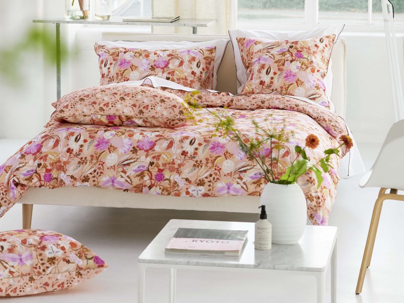 Die Bettwäsche GIRADON CORAL 140×220 aus der DESIGNERS GUILD Kollektion Frühjahr Sommer 2024 ist für uns schon jetzt ein absolutes Lieblingsdesign. Das exotisch anmutende Blumenmeer aus prächtigen Dahlienblüten, Iris, Magnolien und vielen anderen wunderschönen Blumenblüten, die allesamt in den Farben Weiß, Rosa, Pink und Fliederfarben gehalten wurden, hebt sich perfekt von dem korallefarbenen Fond ab. Vereinzelte Blätterzweide in dunklen Erdtönen oder kleine rote Miniblüten, die in symmetrisch angeordneter Form die Rückseite der Satinbettwäsche zieren, lassen das Bettwäschedessin nicht zu grell wirken und sorgen für die Naturverbundenheit und Harmonie in ihrem Schlafzimmer…