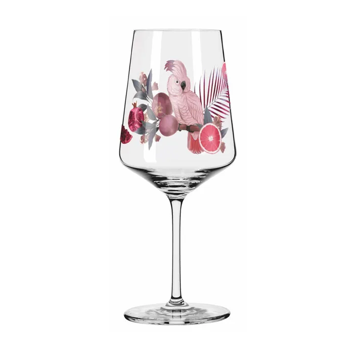 Alltag Adieu: Prachtvolle Kakadus und exotische Früchte reihen sich in zauberhafter Farbkomposition um das Aperitifglas. Das Dekor beflügelt die Sehnsucht hin zu fernen Orten voller Sorglosigkeit.