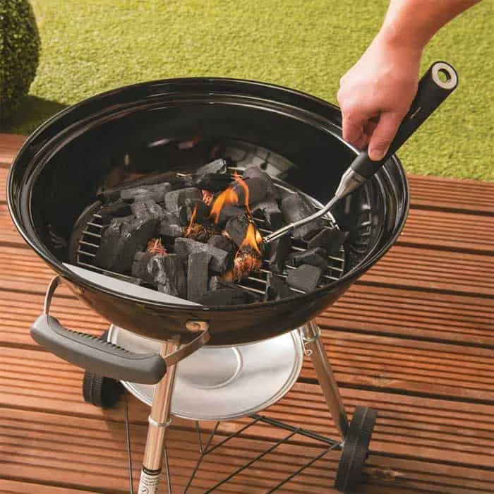 Durch den flexiblen Metallschlauch entzündet das Stabfeuerzeug DRAGO problemlos zwischen Grillrost-Stäben hindurch die Holzkohle!