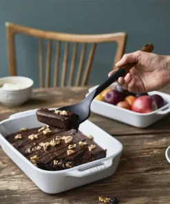Das schwarze, matte Silikon passt perfekt zu unseren gusseisernen Cocottes und Pfannen: Es ist auch für antihaftbeschichtete Oberflächen geeignet, kratzt nicht an Gusseisen- oder Keramikprodukten und ist hitzebeständig bis 220°C, so dass der Servierwender auch zum Kochen verwendet werden kann. Der lange Griff ist ergonomisch geformt und aus Akazienholz gefertigt, was ihm ein außergewöhnliches Aussehen und Haptik verleiht. Der flache Kopf dieses Servierwenders lässt sich leicht unter Speisen wie gegrilltem Fisch oder Pfannkuchen schieben, während die Vorderkante weiche Speisen wie Lasagne durchtrennt und einzelne Portionen serviert. Die drei langen Schlitze verhindern das Anhaften von Speisen und lassen überschüssiges Öl oder Sauce zurück in die Auflaufform oder den Topf tropfen.